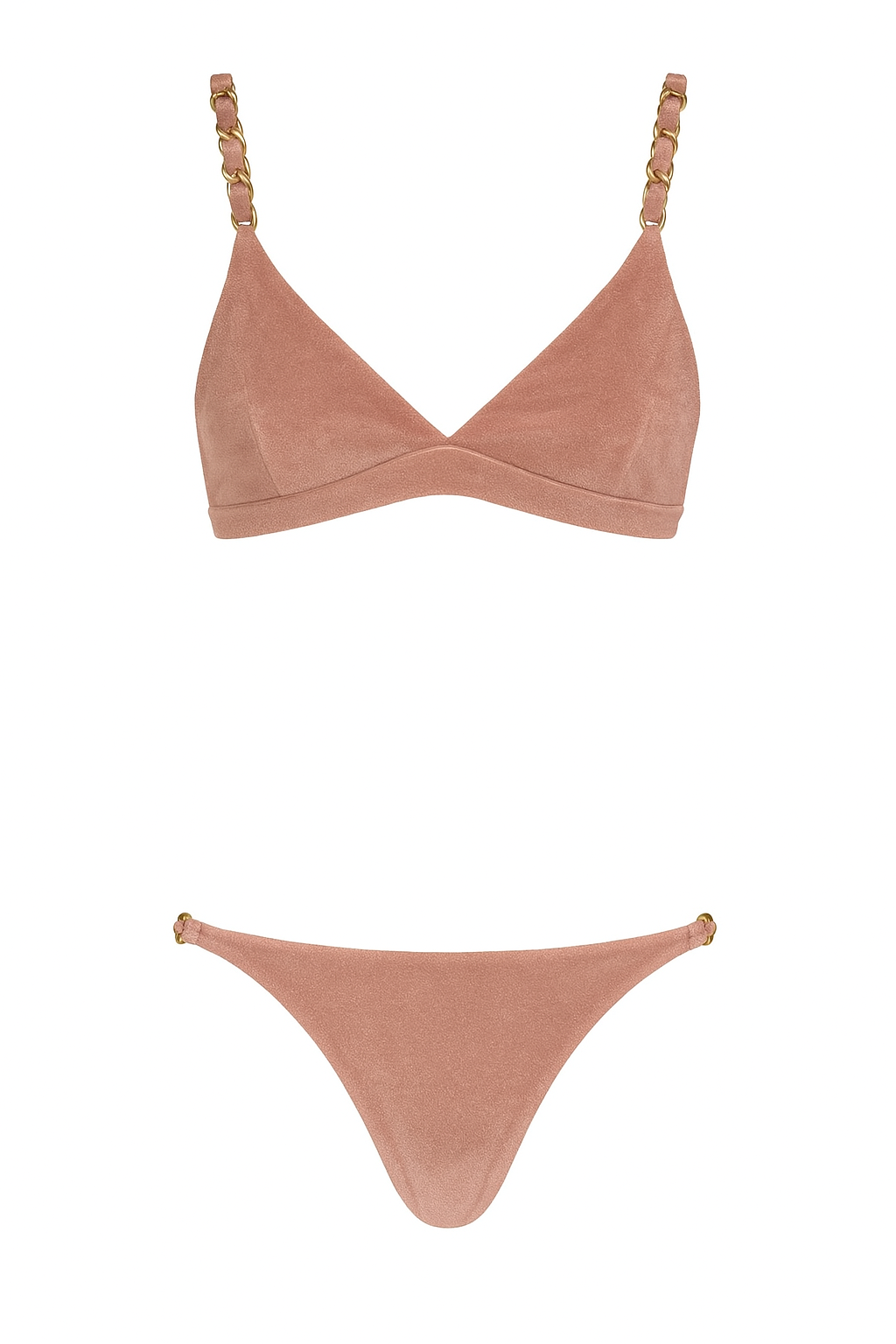 - Bikini realizzato in morbido velluto con leggere catene dorate sul top e lateralmente sullo slip