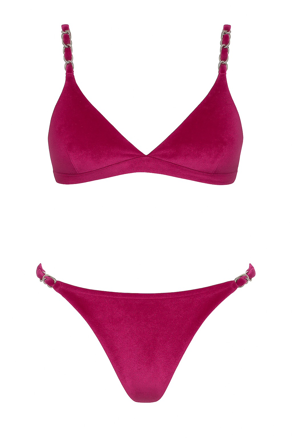 Bikini realizzato in morbido velluto con leggere catene dorate sul top e lateralmente sullo slip