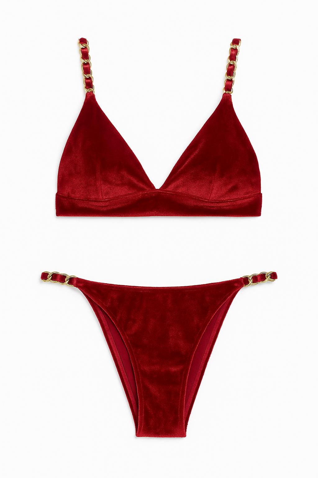 - Bikini made of soft velvet with light golden chains on the top and on the side of the bottom